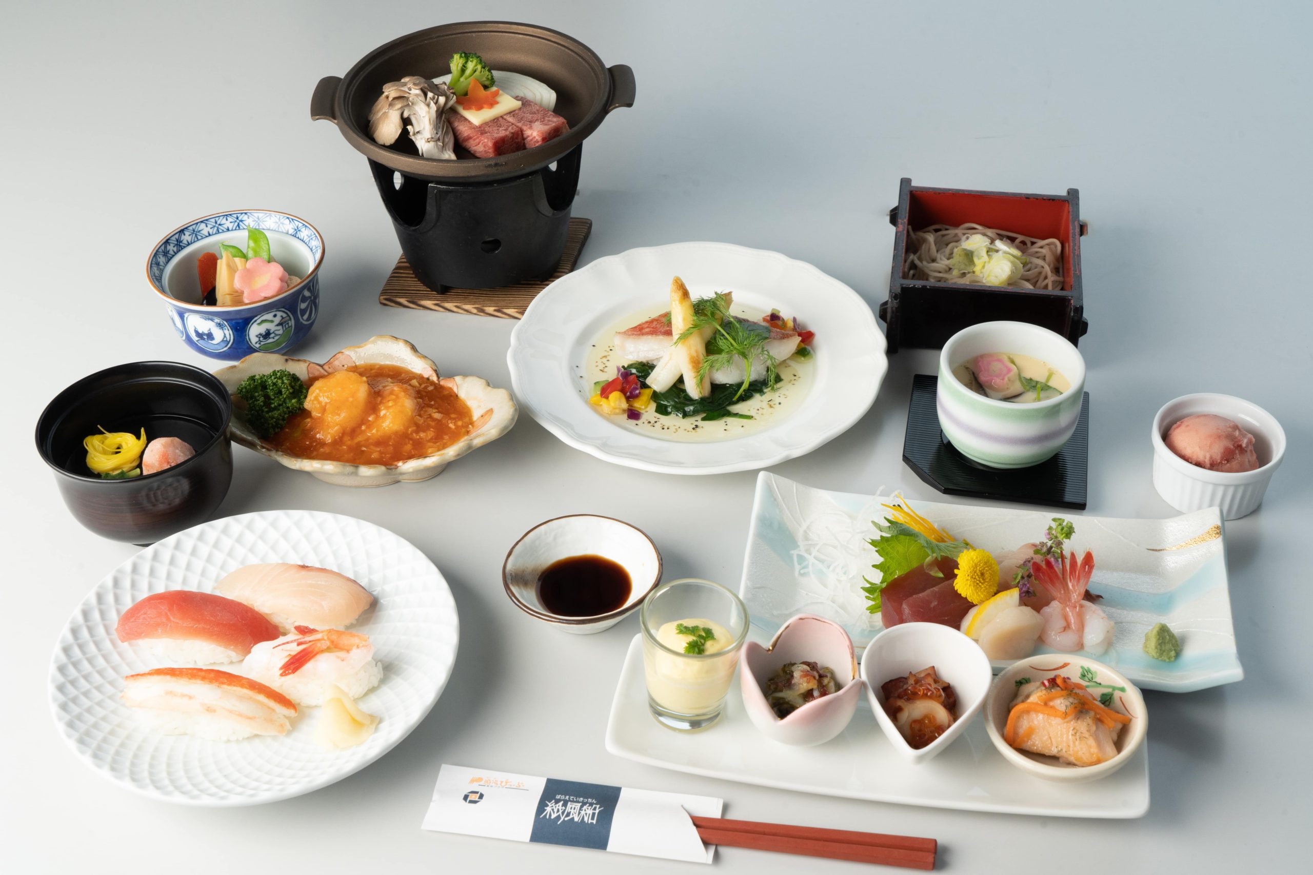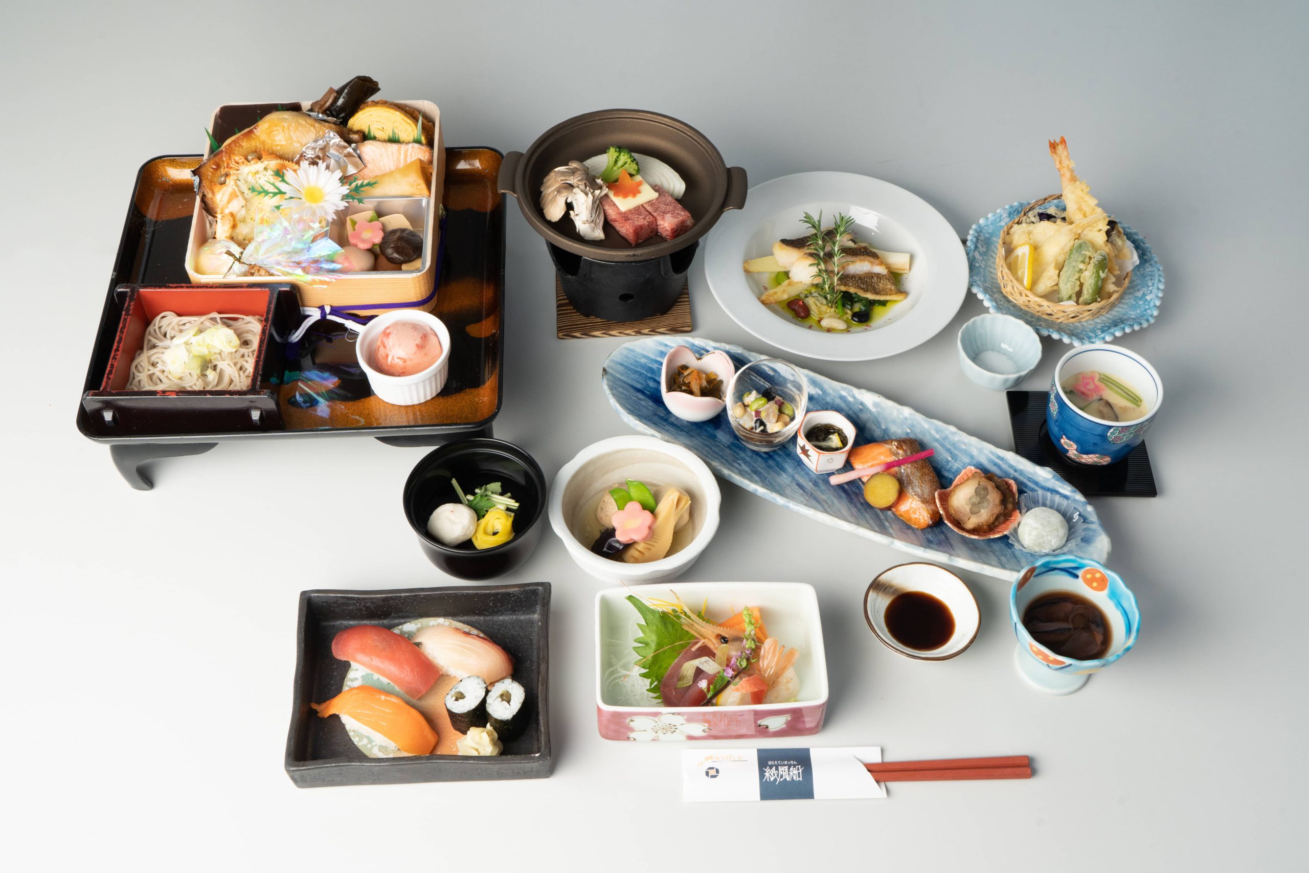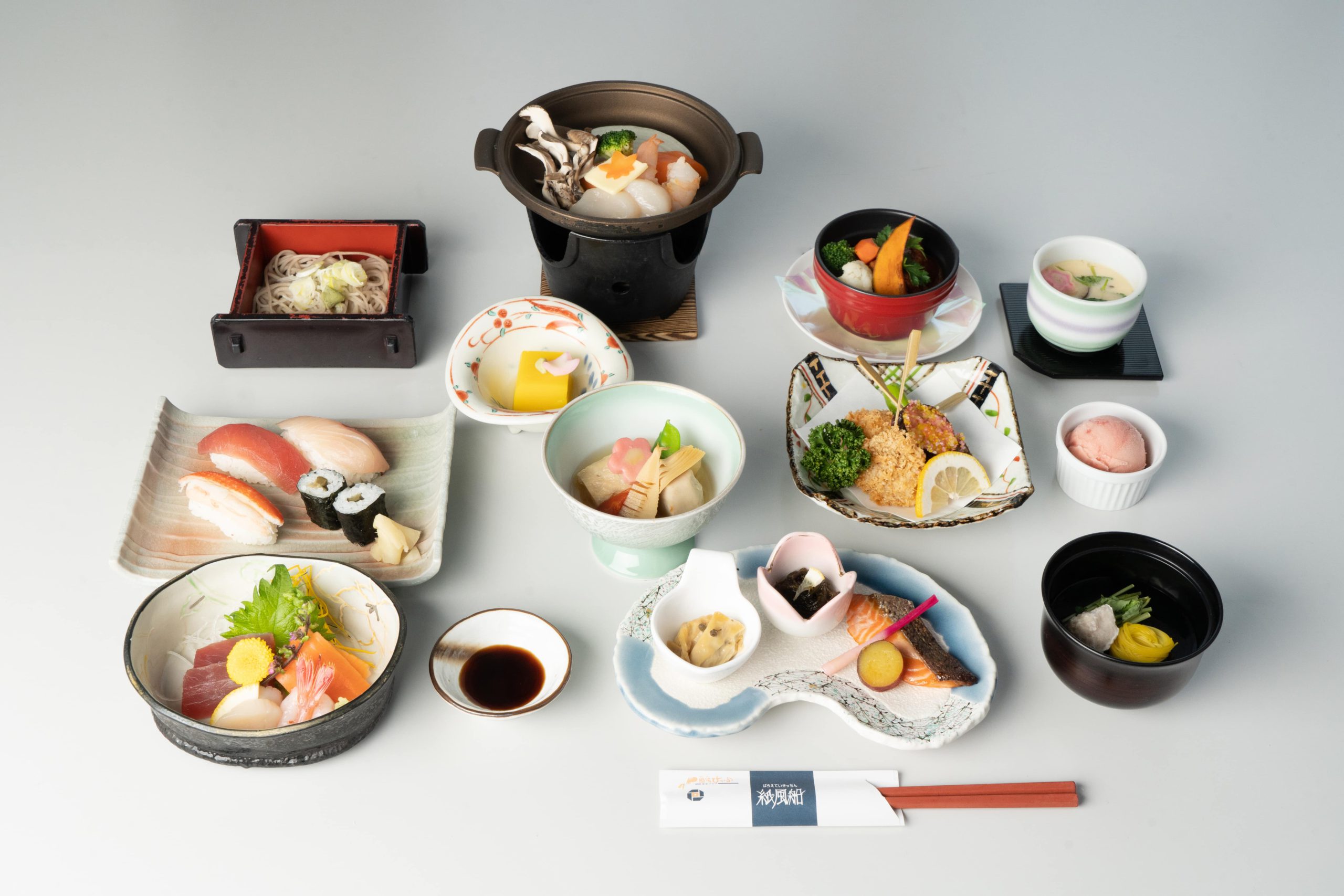 食材の味わいを最大限に引き出す職人の技をご堪能ください。前菜、刺身、煮物、蒸物、鍋物、洋皿、中華、生寿司、吸物、そば、デザート