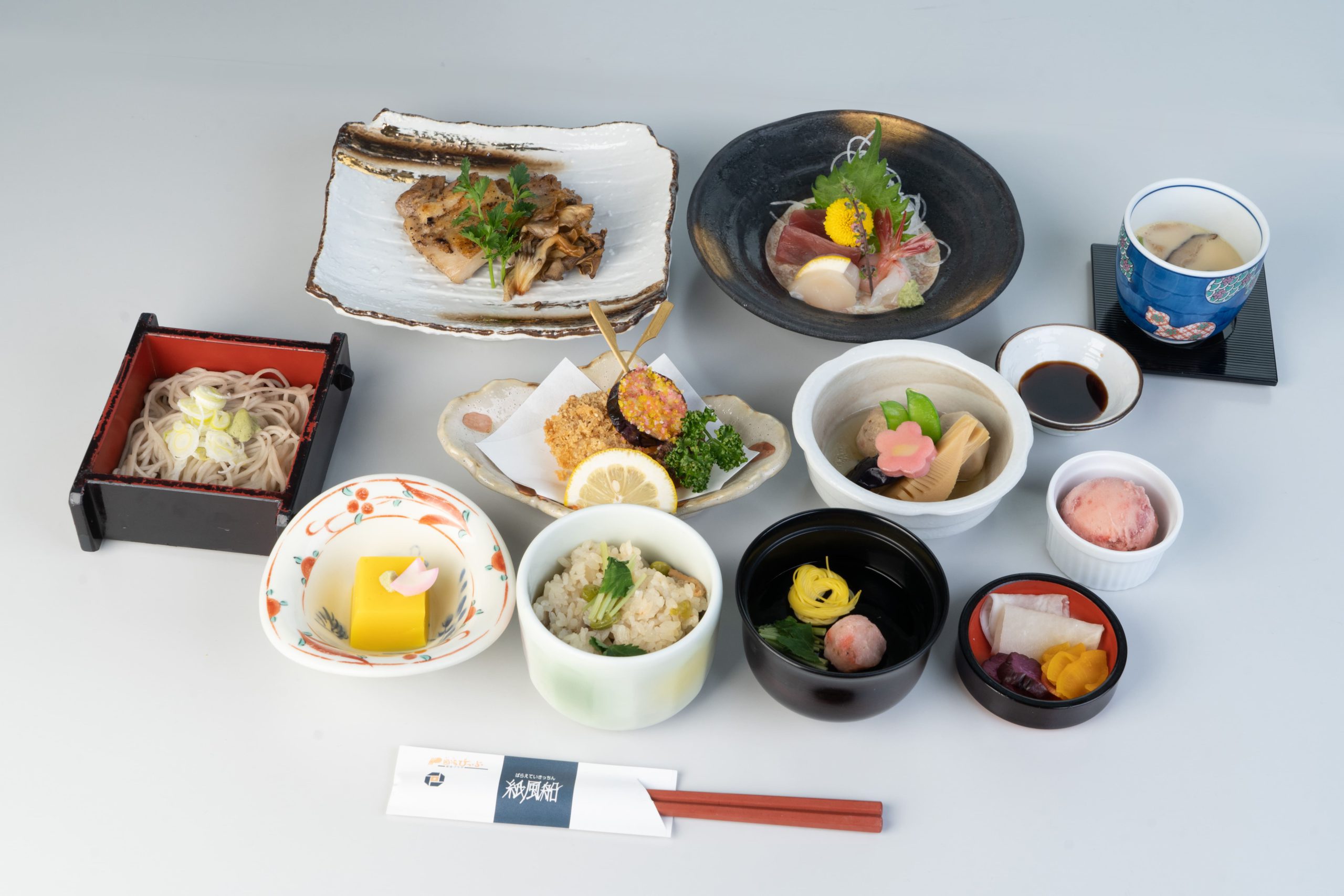 心も浮き立ついろどり鮮やかな会席膳。ヘルシーな食材でみずみずしい美味を提供します。先付、刺身、煮物、蒸物、揚物、洋皿、御飯、吸物、香の物、そば、デザート
